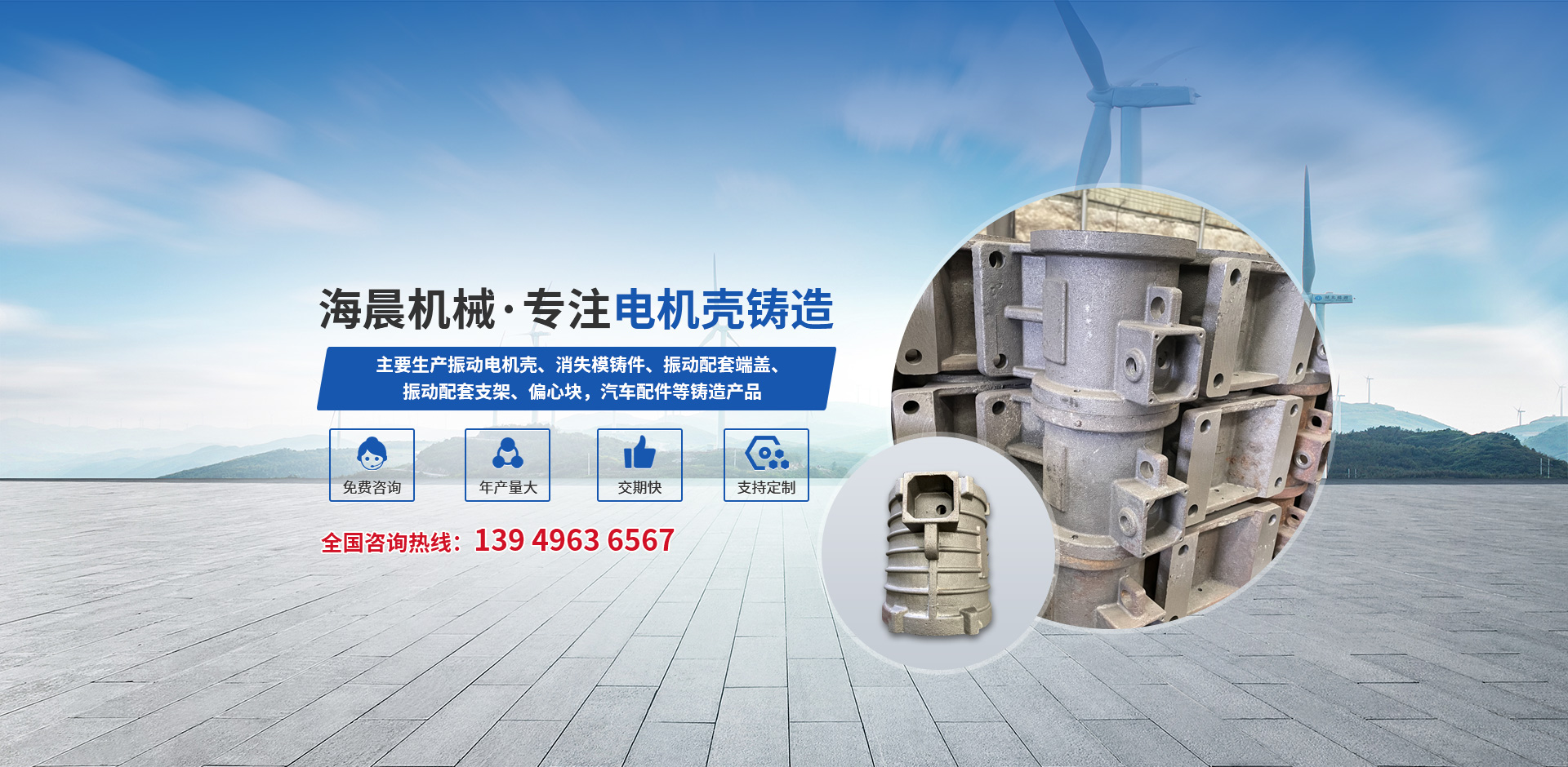 新鄉(xiāng)縣海晨機(jī)械有限公司,始建于1996年,我公司擁有垂直造型生產(chǎn)線,年設(shè)計(jì)產(chǎn)量5萬噸,主要生產(chǎn)振動電機(jī)殼、消失模鑄件、振動配套端蓋、振動配套支架、偏心塊,汽車配件等鑄造產(chǎn)品,公司占地面積1500平方米,現(xiàn)有員工100余人,其中工程師5名,技工12名,固定資產(chǎn)1500萬,擁有生產(chǎn)設(shè)備60多臺(套)。我們遵循“團(tuán)結(jié)、敬業(yè)、創(chuàng)新”的敬業(yè)精神,始終堅(jiān)持以技術(shù)為后盾,以質(zhì)量求發(fā)展,以客戶需求為己任,不斷致力......